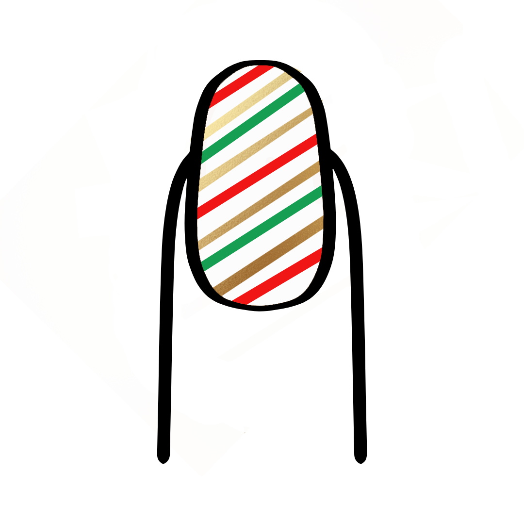Trace des lignes fines rouges, dorés et vertes en diagonale avce le stylo de tes vernis YAKA pour un vrai look de candy cane.